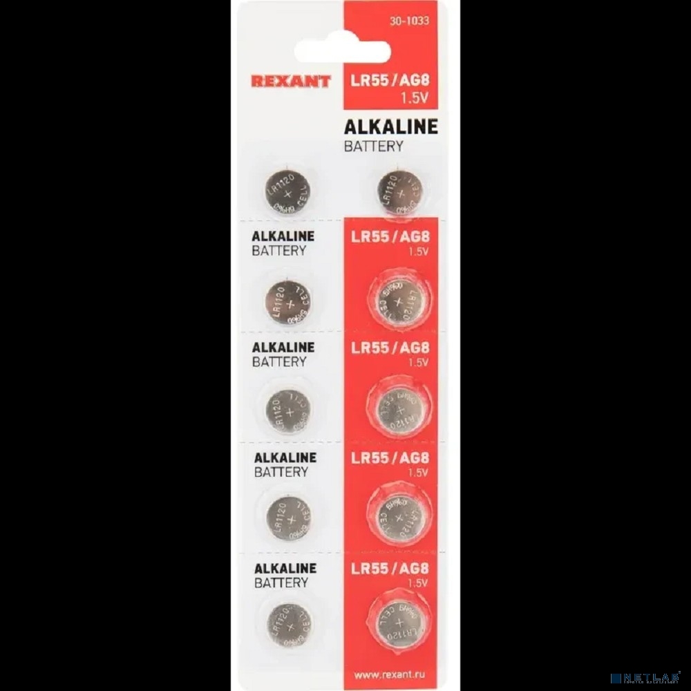 НазваниеRexant (30-1033) Батарейка часовая LR55, 1,5В, 10 шт (AG8, LR1120, G8, 191, GP91A, 391, SR1120W) блистер